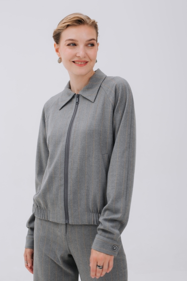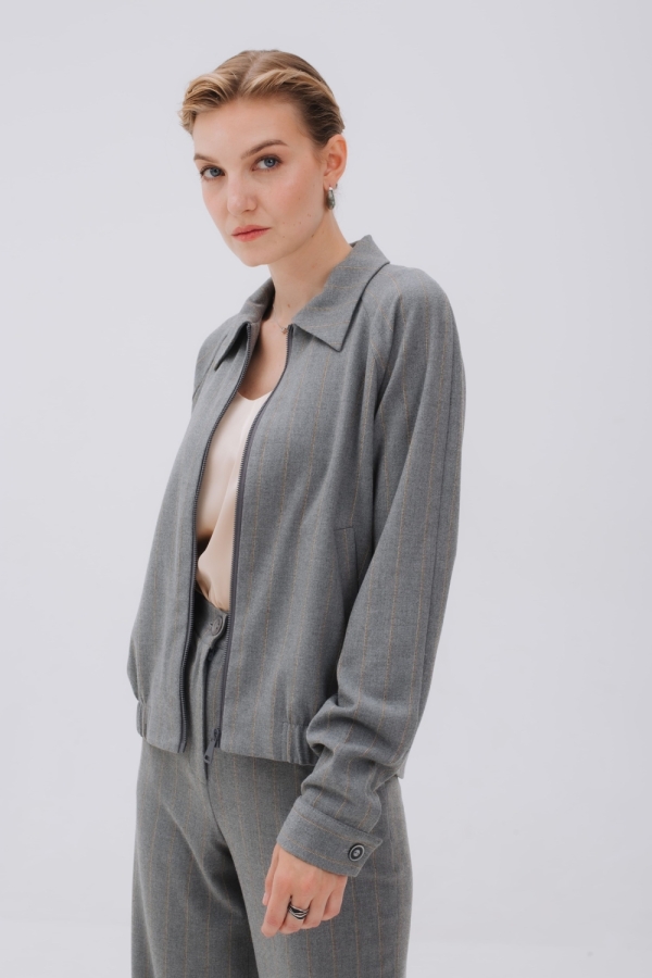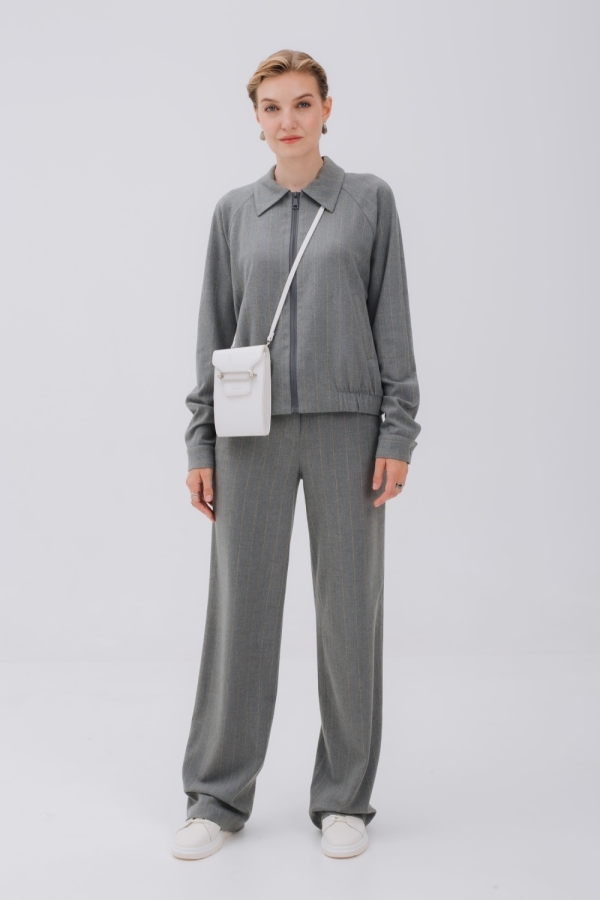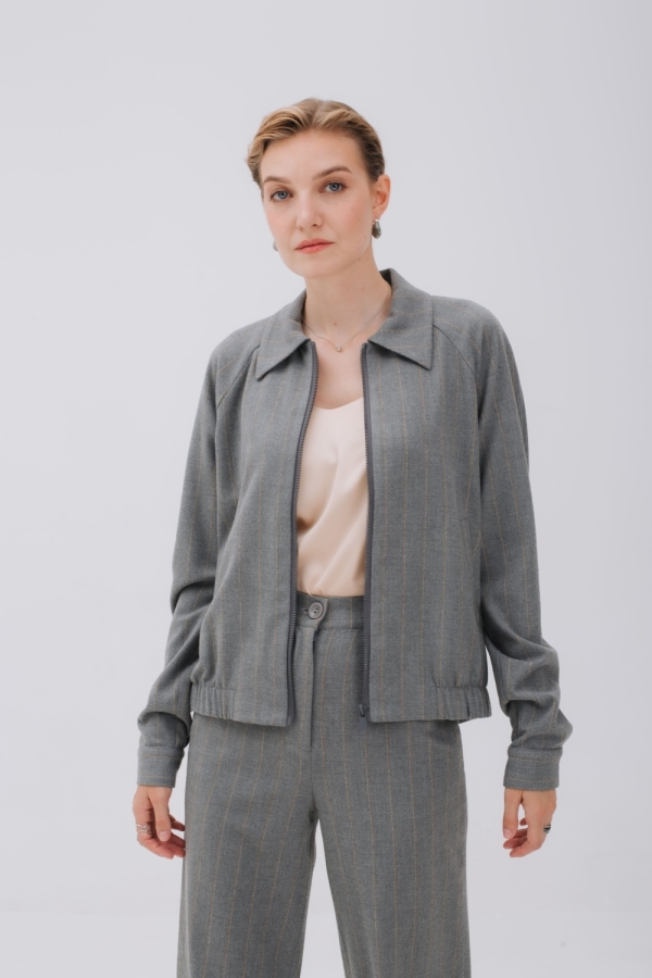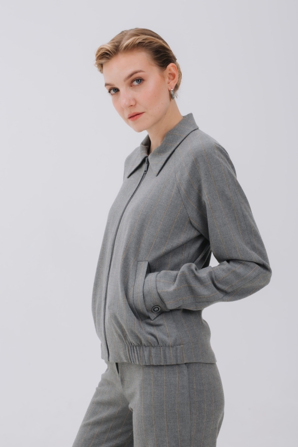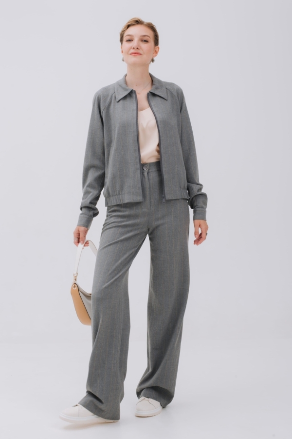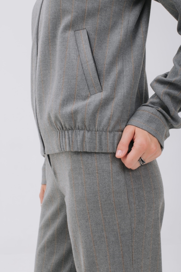 Бомбер из мягкой теплой ткани фланель с полоской бежевого цвета создаст стильный аутфит для повседневных дел и прогулок. Модель на молнии, с воротником и карманами в листочку. Рукав реглан, спереди вставки из резинки на поясе позволяют зафиксировать изделие на бедрах. По спинке бомбер длиннее и низ изделия имеет форму полукруга. Можно носить с брюками из комплекта, базовым денимом и брюками в стиле кэжуал-шик.
