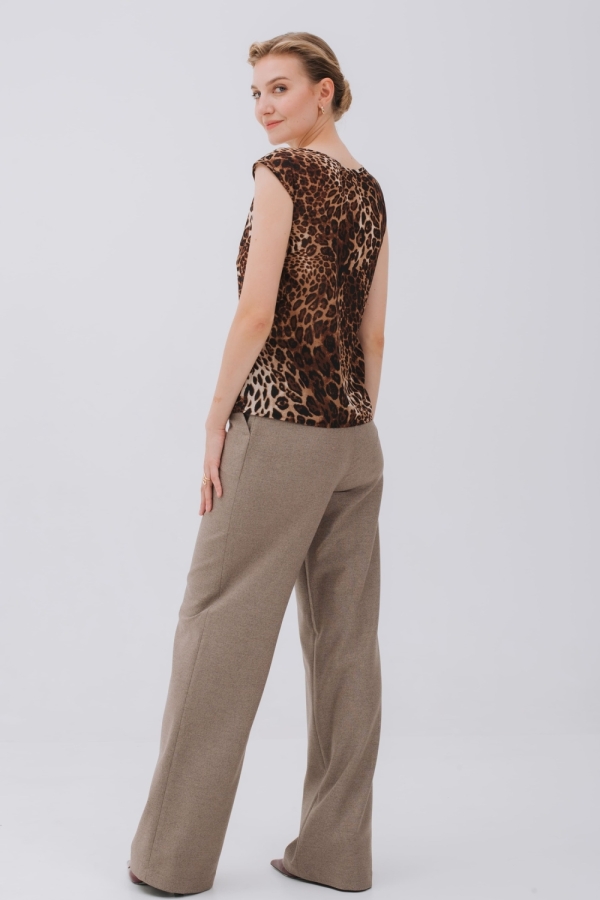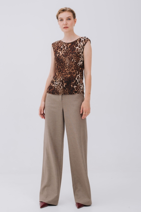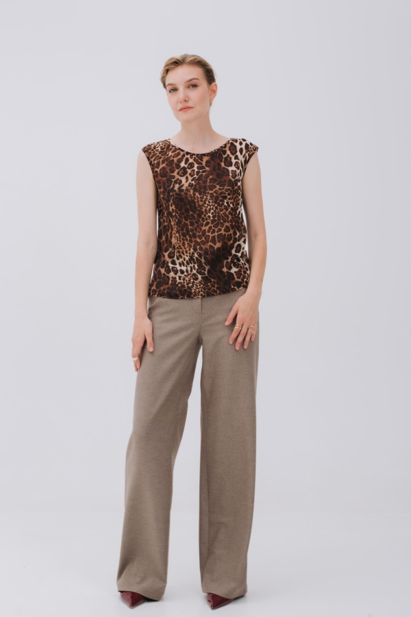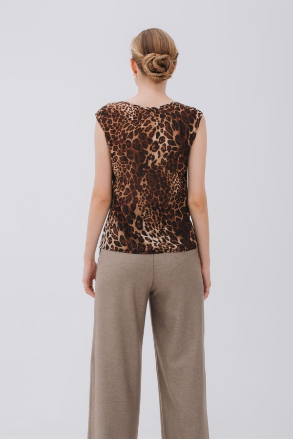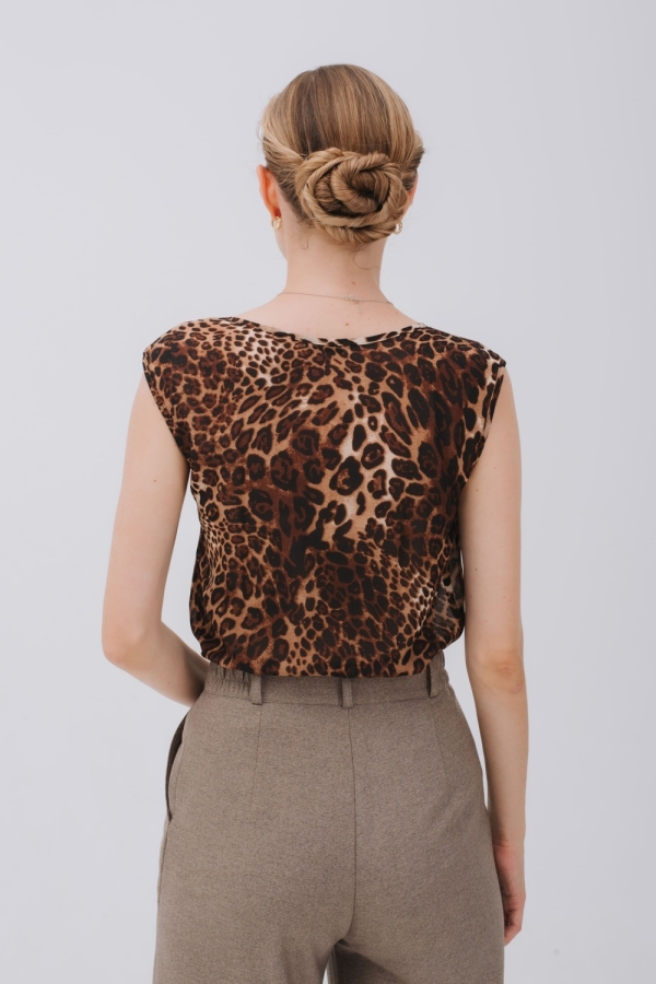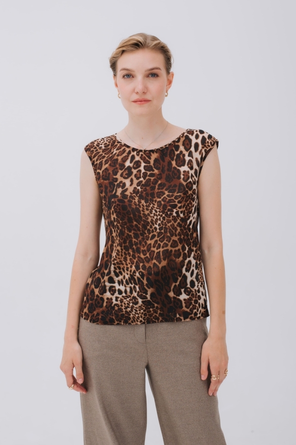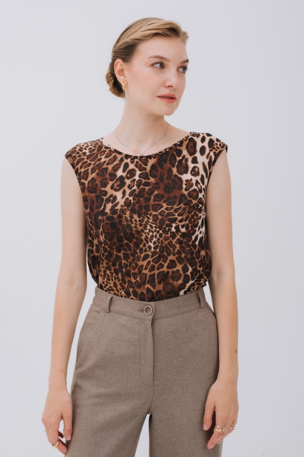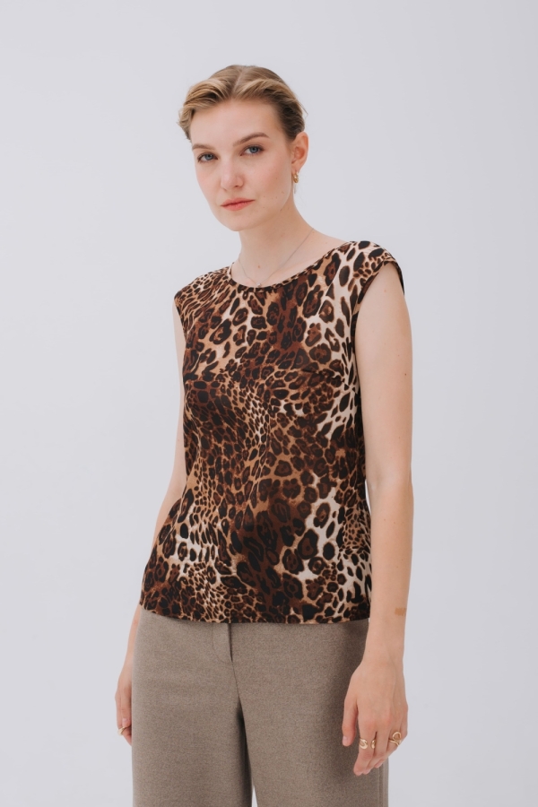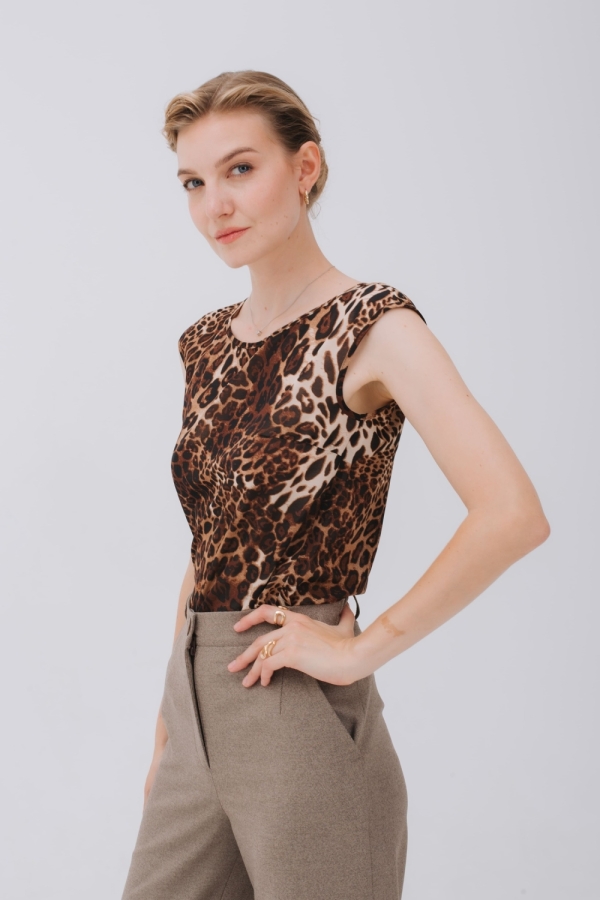 Топ из эффектной ткани леопардового цвета. Силуэт выгодно подчеркивает линию плеч. Стильная базовая вещь, которая сочетается как с деловым так и неформальным гардеробом. Идеальна в комплекте с широкими черными брюками из той же капсулы