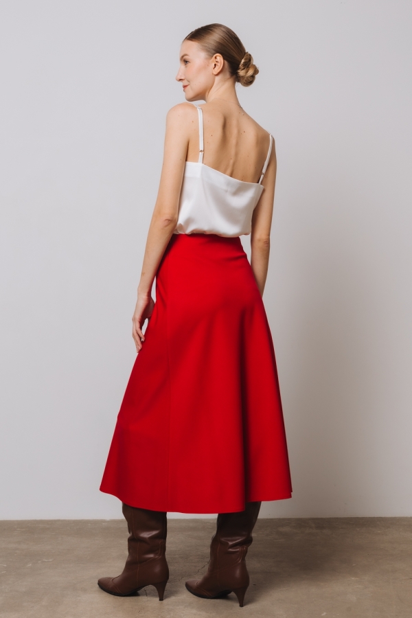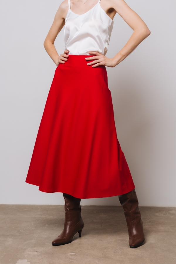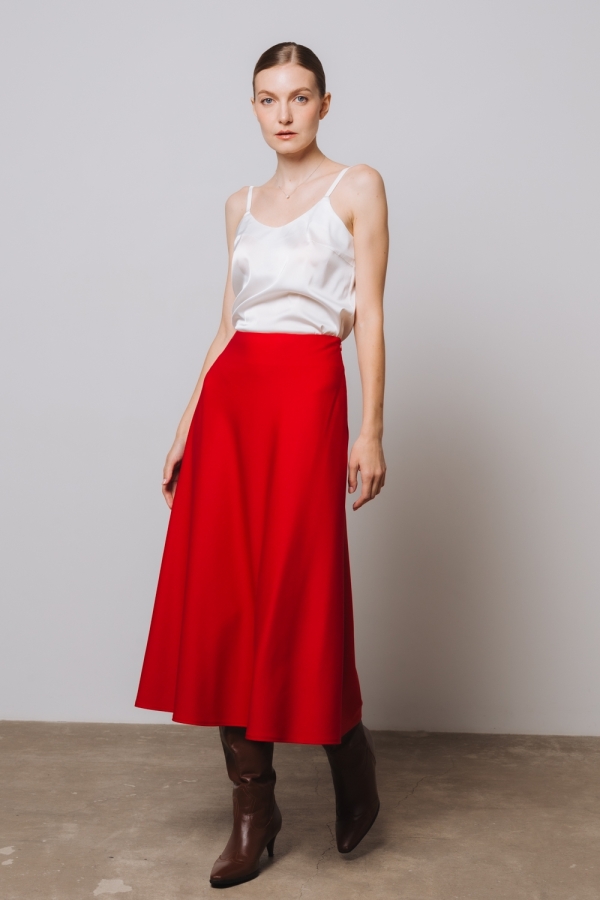 Юбка-миди красного цвета - яркий выбор этого сезона. Элегантная модель гармонично дополнит романтичный женственный наряд или добавит утонченный штрих повседневному образу с базовыми вещами.