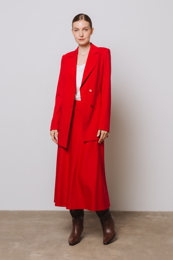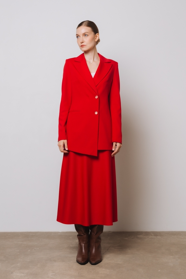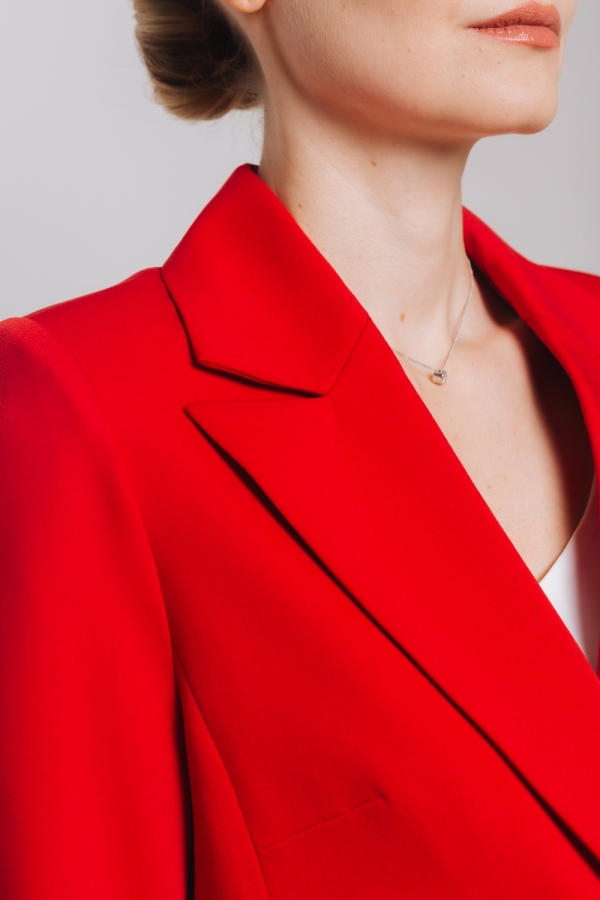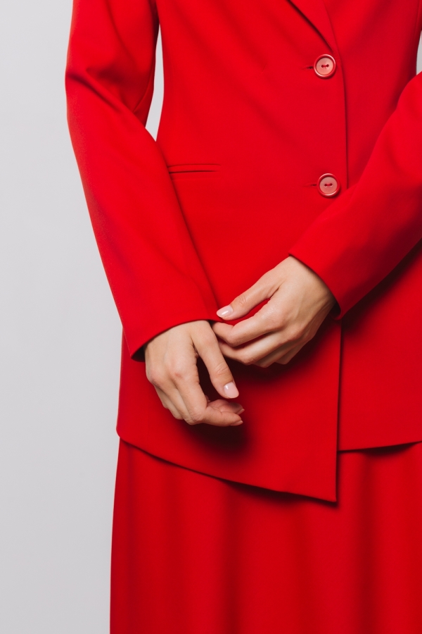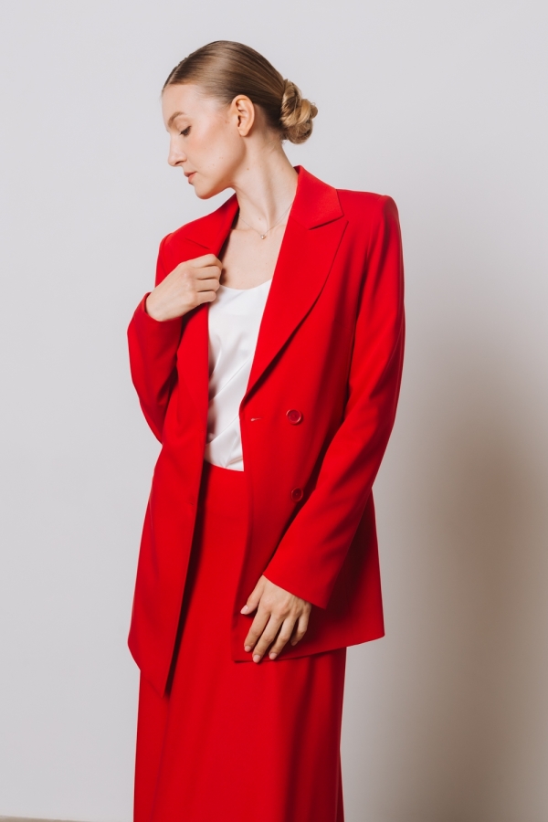 Жакет из плотной костюмной ткани в красном цвете. Материал хорошо держит форму и долго прослужит в носке за счет прочных волокон вискозы и полиэстера. Сочетайте жакет с брюками из той же ткани, создавая стильный тотал-лук в офис, или с джинсами и футболкой для более расслабленного образа в стиле кэжуал.